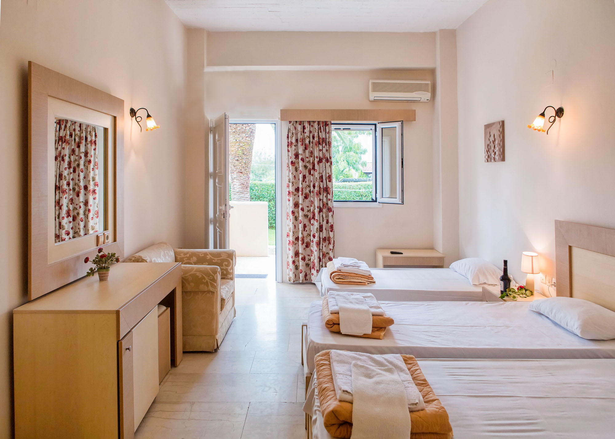 The rooms are equipped with a small refrigerator, free internet, TV, air conditioning, and hairdryer. Double rooms (12 sq m) are available with either a double bed or two separate beds (no extra bed available). Triple rooms (21 sq m) include a double bed and a single bed, while quadruple rooms (21 sq m) feature a double bed and a sofa bed.