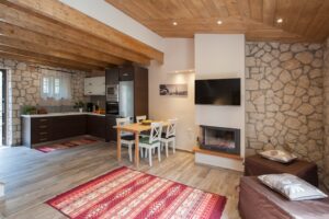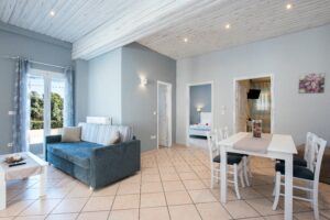 • Luxury maisonette apartments: arranged over two floors with a terrace, accommodating up to 5 people, and equipped with a fireplace, washing machine, and ironing facilities.