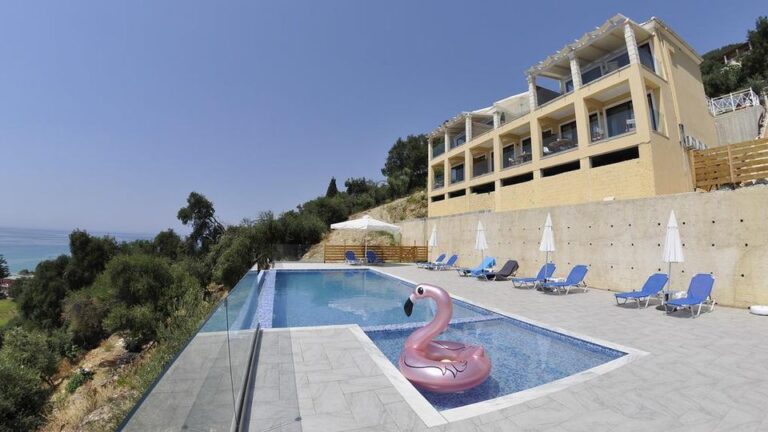 Agios Gordios, central part of the island. Approximately 10 km from the airport (about 30 minutes drive) and 400 m from Agios Gordios sandy beach. Note: the route to the beach involves going down a hill and up a mountain, so it is not recommended for guests with mobility difficulties.