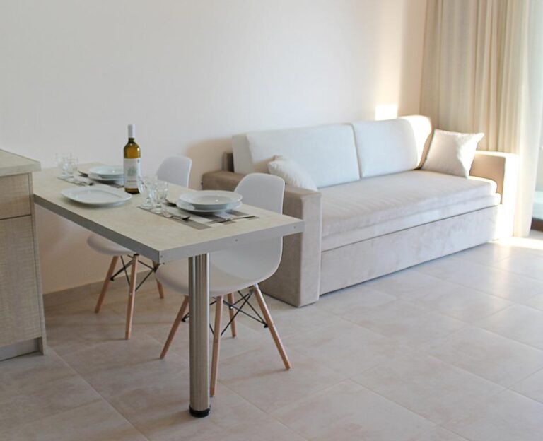 The apartments feature a bedroom and living room connected to the kitchen, with kitchenware, stove, refrigerator, and toaster. Each unit includes air conditioning, TV, free internet, hairdryer, towels, and bed linen.
