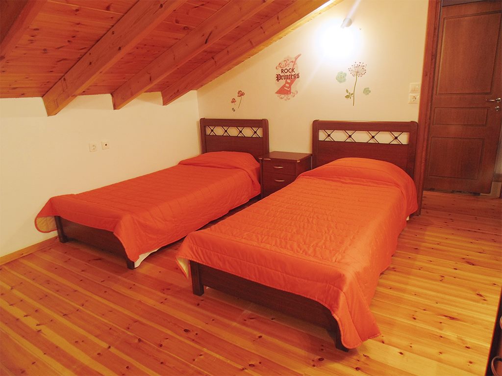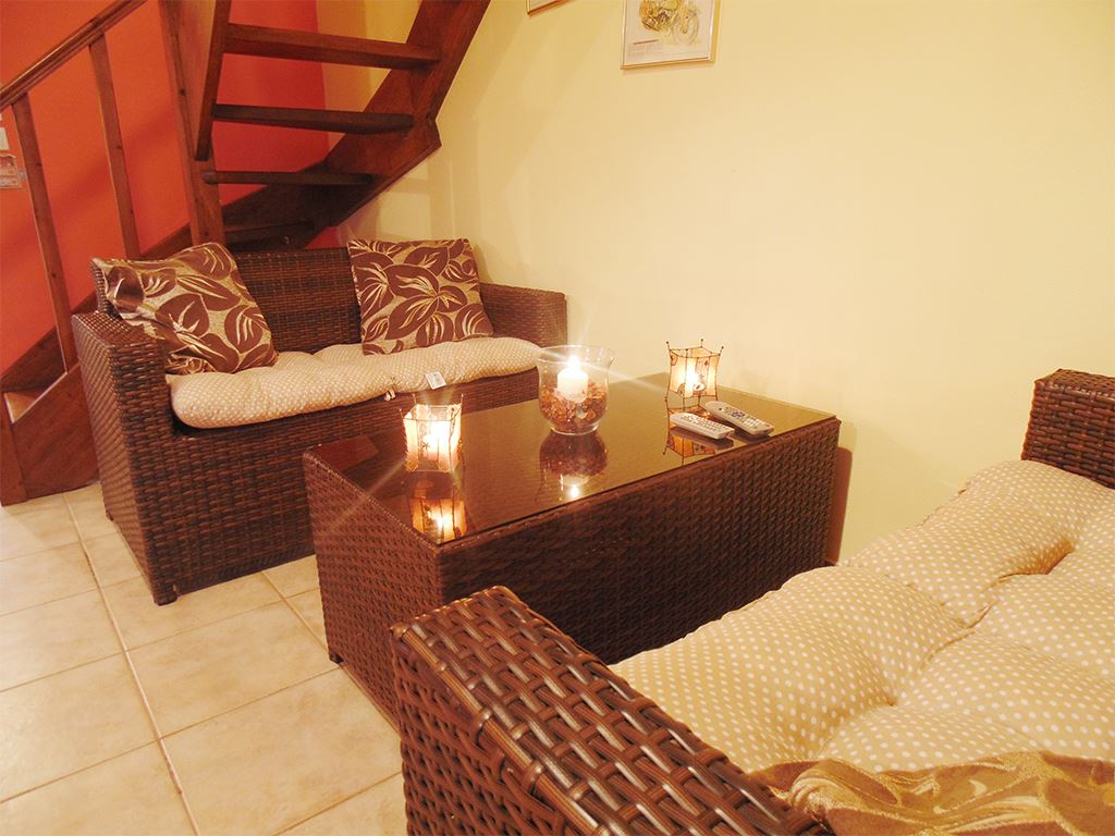 Separate entrance via stairs from the courtyard. Two rooms with a common living room and kitchen, small balcony, seating area with TV, and dining table with chairs. The kitchen includes cooking utensils, stove, refrigerator, and kettle. One bedroom has two single beds, and the other has one double bed. Shower and toilet are included.
