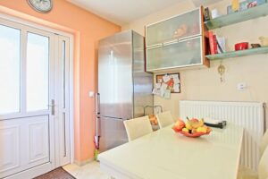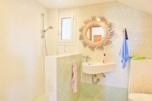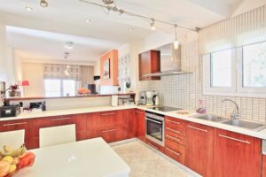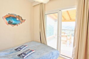 The house is arranged over two floors. The ground floor features an open-plan living area with kitchen and dining space, as well as a double bedroom with balcony access and a shower room. Stairs lead to the second floor, where there are two additional bedrooms—one with a double bed and the other with two separate beds—both with access to a balcony. The villa accommodates 6 guests, with the possibility of one additional person.